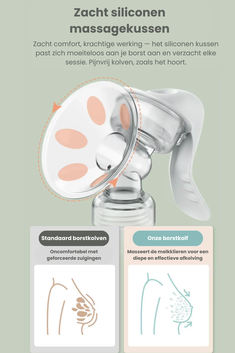 The Milkinator Borstkolf combineert gebruiksgemak met comfort dankzij het zachte siliconen massagekussen dat zich perfect aanpast aan de vorm van je borst. De diepe en effectieve afzuiging zorgt ervoor dat je snel en efficiënt kunt kolven, terwijl het hittebestendige materiaal veilig te steriliseren is voor optimale hygiëne. Zo ben je verzekerd van een betrouwbare en comfortabele kolfervaring, elke keer weer.